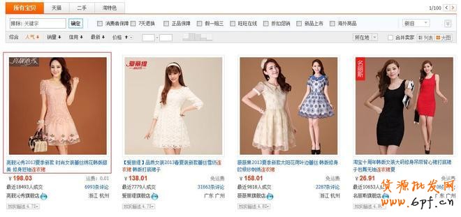 我們先觀察一些豆腐塊的寶貝,看看有什么共同點(diǎn)——搜索“連衣裙”,默認(rèn)顯示如下圖所示: