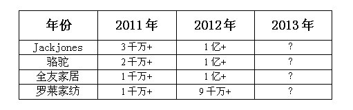 從具體數(shù)據(jù)來看,Jackjones、駱駝服飾、全友家居、羅萊家紡等傳統(tǒng)企業(yè)率先領跑。11.11開始后30分鐘,駱駝、Jackjones、GXG即突破千萬元;駱駝在當日12點成為第一個破億的品牌,成交額遠高于去年。