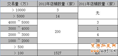 與2011年相比,2012年銷量達千萬以上的店鋪是去年的 4.7 倍,百萬以上銷量店是去年的 3 倍。