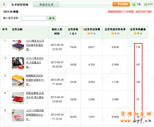 2)量子恒道——銷售分析——寶貝銷售排行(重點篩選三個數(shù)據(jù),訪客數(shù)、轉化率、收藏量,然后以月度收藏量從高到低排序)