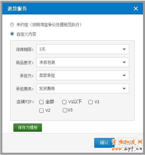 交易合約二期將開設(shè)VIP設(shè)置的服務(wù)為破損補(bǔ)寄、品質(zhì)承諾、退貨承諾。買家在登陸淘寶賬號(hào)后,會(huì)根據(jù)買家先前在店鋪的購(gòu)買記錄,被判斷出店鋪VIP等級(jí)數(shù)據(jù),然后只顯示賣家對(duì)相應(yīng)買家等級(jí)設(shè)置的服務(wù)內(nèi)容。例如賣家在模塊中設(shè)置V2、V3、V4等級(jí)買家可享受退貨承諾,賣家對(duì)保障期限、商品要求、費(fèi)用承擔(dān)方等都已明確填寫,則在此范圍內(nèi)的買家可享相應(yīng)服務(wù)。