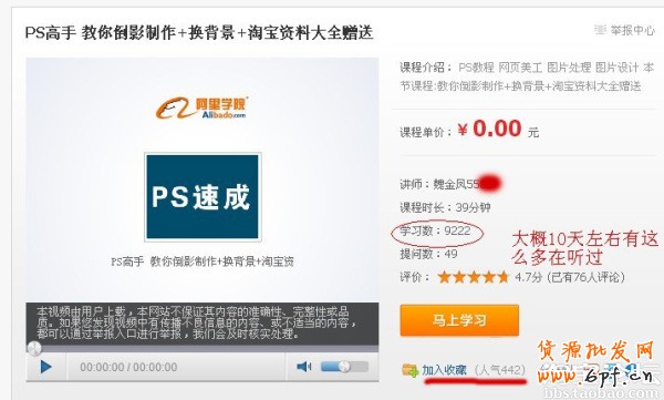 本人有5年的平面設計經(jīng)驗,突發(fā)奇想的錄了一節(jié)PS制作動畫的課程。之前我在社區(qū)發(fā)表過關于PS制作動畫的貼子,可是社區(qū)老大看不上,給我的回復是這類的貼子太多了,沒有太多的學習價值,一急之下,我就把課程錄下來,發(fā)表到阿里學院了,當然在課程里面有我的店鋪名。第一次講課。大家給我的評論是很高的。這時你又為會問,我聽阿里學院的課呀,但是我一般很少搜索老師的店鋪,更別說去收藏寶貝了。