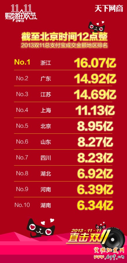 2013年11月11日11點11分,天貓雙11支付寶成交額163億!各位,節(jié)日快樂哈哈!