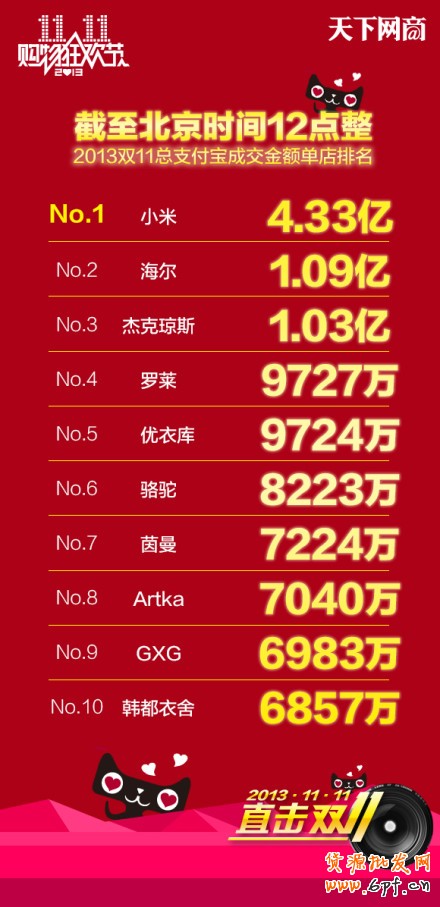 截止至2013年11月11號12點整,港澳臺及海外成交總額達到了1億?。。?!
