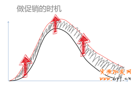 上面已經(jīng)說過了上半截結(jié)論,就是“促銷不能做成常態(tài)”。所以什么時候做呢?看下面這個圖,一個銷售、一個店鋪、一個產(chǎn)品都有一個生命周期,它的自然生命曲線,隨時間變化的是下面的粗線。我們希望變成上面細線的樣子。所以,我們說促銷的價值,是陰影部分;而且,在箭頭所指的幾個地方做促銷,效果會好。
