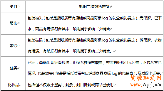 商品狀態(tài)中涉及的是否影響二次銷(xiāo)售,以下表中各類(lèi)目的定義為準(zhǔn):
