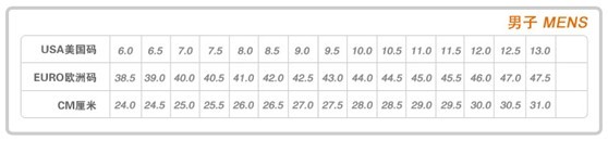 (1) 標(biāo)準(zhǔn)化的尺碼表,包含US尺碼、歐洲碼和厘米的對(duì)應(yīng)。