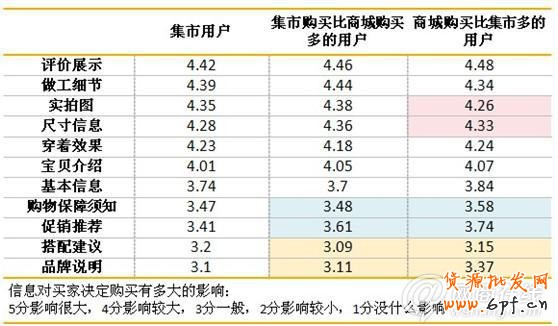 而通過(guò)對(duì)以上11類信息的買家評(píng)分,我們發(fā)現(xiàn)評(píng)價(jià)展示和做工細(xì)節(jié)是買家認(rèn)為對(duì)購(gòu)買決策影響最大的類別。一個(gè)區(qū)別就是商城型的買家更在意評(píng)價(jià)、而集市型的買家更在意做工細(xì)節(jié)。