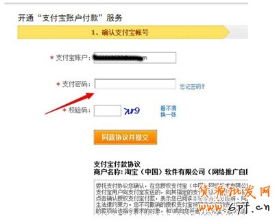 第五步,開通支付寶賬戶付款服務(wù),然后輸入支付寶賬號和密碼,點擊同意協(xié)議并提交申請。提交后就完成了開通淘寶客推廣。(這協(xié)議是為以后成交產(chǎn)品扣除傭金需要用的。)