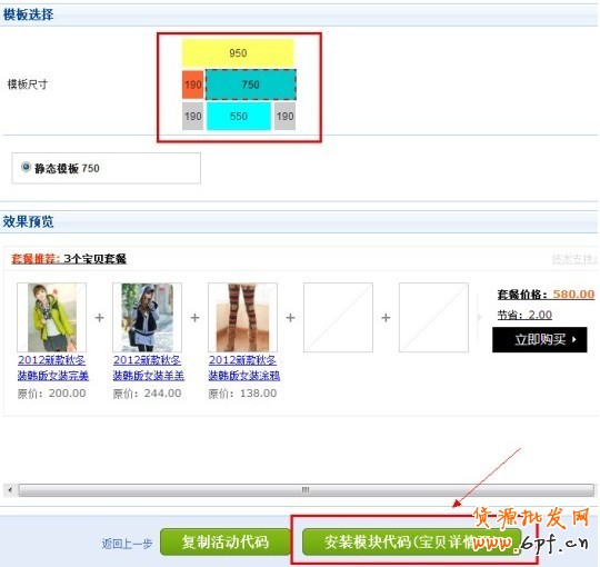 6、選擇合適模板尺寸,預(yù)覽效果,點(diǎn)擊【安裝模塊代碼(寶貝詳情頁)】