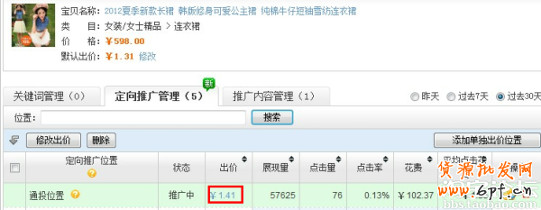 出價1.41,流量一個月才76個,說明這款寶貝的定向隱性質(zhì)量得分非常低。那么如何提高定向的質(zhì)量得分從而提高定向流量,達到0.4出價,引13000個點擊每天呢? 寶貝前期的點擊率非常重要。
