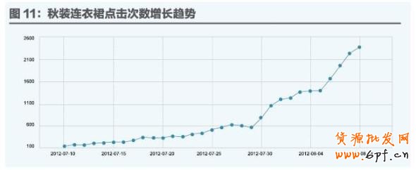 同時我們可以觀察某個關(guān)鍵詞如“秋裝連衣裙”的點擊次數(shù)趨勢圖和子類目分布趨勢圖(圖11和12),可以看到消費者的點擊有一個爆發(fā)性增長的過程。單純地看某一個詞的搜索飆升,無法體現(xiàn)出消費者的關(guān)注度在時間維度的擴展,只有在消費者點擊增長階段去投放直通車,才會獲得比較高的轉(zhuǎn)化率。