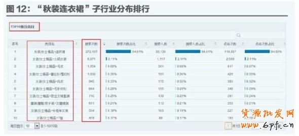 繼續(xù)查看該熱詞的子行業(yè)分布排行,就可以定位“秋裝連衣裙”搜索人群涉及的主要類目,方便在投放前去做參考。