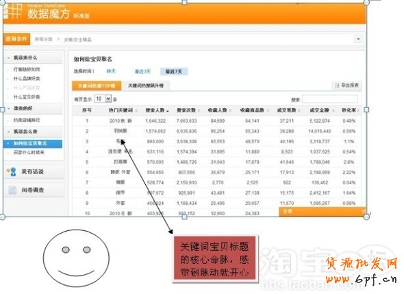 如何給寶貝起名:可以讓我們迅速了解到最熱門的搜索的關(guān)鍵詞,協(xié)助我們幫自己的寶貝起個好名字,這樣買家才會迅速的搜索的我們店鋪里的寶貝,這個是特別值得大家研究的一塊。如圖展示:(此圖來源于本人所購買的標(biāo)準(zhǔn)版數(shù)據(jù)魔方)