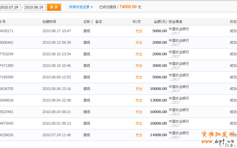 最后再給大家看看七月底到今天,也就是23號(hào)幫派買(mǎi)家秀貼成功推薦后,我20天的提現(xiàn)記錄吧。這些再加上我網(wǎng)上購(gòu)物和采購(gòu)花掉的一部分,以及顧客銀行打款的一部分,已經(jīng)是10萬(wàn)以上了,呵呵。而這只是20天的收入,我相信等到八月底一部分買(mǎi)家確認(rèn)收貨后,應(yīng)該會(huì)去到15萬(wàn)左右了吧。