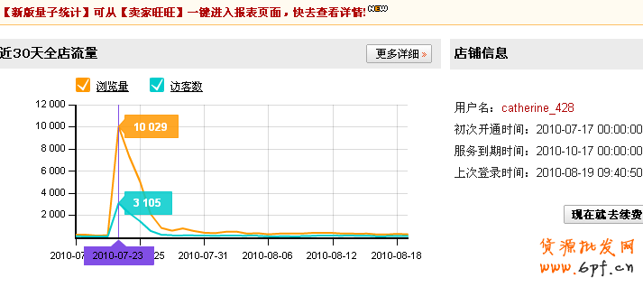呵呵,這個(gè)淘寶量子統(tǒng)計(jì)是2010年7月17號(hào)才買(mǎi)的,價(jià)格不貴,好像一季才幾十塊。數(shù)據(jù)分析很全面,而且正好記錄了買(mǎi)家秀貼上幫派推薦位的這一周的井噴數(shù)據(jù)!23號(hào)貼子上推薦位的當(dāng)天,貼子瀏覽量是近兩萬(wàn)左右,店鋪流量是一萬(wàn)多,店鋪銷(xiāo)售額是一萬(wàn)多。大家請(qǐng)看下面這些數(shù)據(jù)截屏。這個(gè)瀏覽量和銷(xiāo)量的轉(zhuǎn)換率非常高哈!