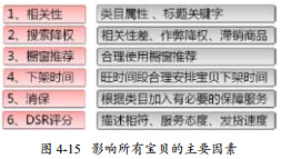 影響所有寶貝的主要因素有6個(gè),相關(guān)性、搜索降權(quán)、櫥窗推薦、下架時(shí)間、消保、DSR評(píng)分,如圖4-15所示。