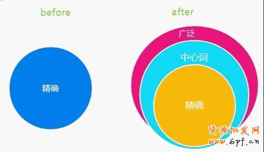 淘寶直通車關(guān)鍵詞匹配方式有:廣泛匹配、中心詞匹配、精確匹配這三種,三者所覆蓋范圍的關(guān)系:廣泛匹配的展現(xiàn)流量范圍包含中心詞匹配和精確匹配,中心詞匹配的展現(xiàn)流量范圍包含精確匹配(如圖所示)。淘寶學(xué)堂(http://www.tbxt.com)http://www.tbxt.com