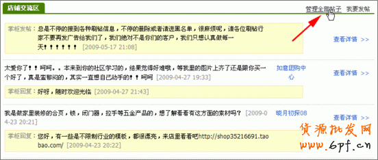 登錄店鋪首頁(yè),找到淘寶店鋪交流區(qū),右上角上點(diǎn)擊“管理全部帖子”;