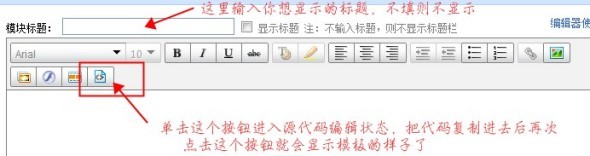 首先解釋一下這個(gè)標(biāo)題,一個(gè)模塊就是一個(gè)單獨(dú)的個(gè)體,每個(gè)模塊上面都可以有標(biāo)題,我們可以自定義成“本店熱賣”、“特價(jià)促銷”等等這些標(biāo)題,標(biāo)題填好了記得勾選后面的復(fù)選框,否則也是不顯示的哦。當(dāng)然你嫌有個(gè)標(biāo)題不好看的話就不用管它了,然后點(diǎn)擊下面框框里面的源代碼標(biāo)識(shí)進(jìn)入代碼編輯狀態(tài)