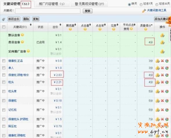 3.關(guān)鍵詞質(zhì)量得分8-10適合出高價(jià),,6-7分詞跟寶貝相關(guān)詞考慮優(yōu)化,6分以下關(guān)鍵詞考慮直接刪除,換成跟寶貝相關(guān)的其他關(guān)鍵詞,注意及時(shí)替換無(wú)展現(xiàn)關(guān)鍵詞