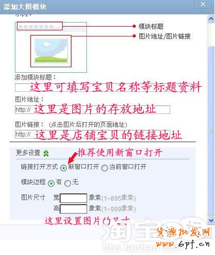 鏈接打開方式:理所當(dāng)然選擇新窗口打開,這樣點(diǎn)擊圖片以后,會(huì)在一個(gè)新的窗口,打開您淘寶店鋪的詳情頁(yè)面!
