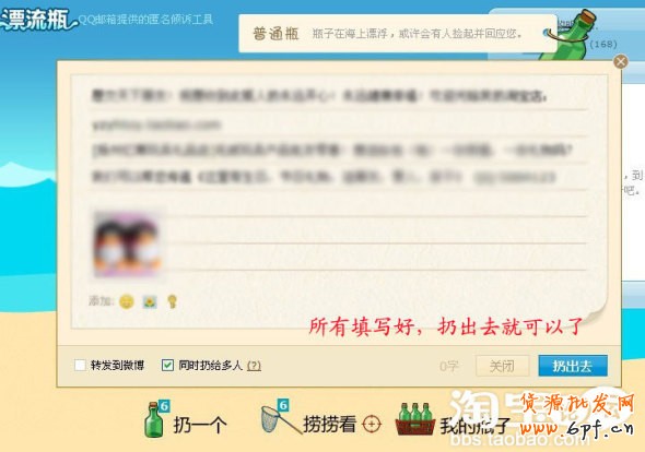 寫好我們的內(nèi)容,放上我們的寶貝圖片以后,就可以扔了,我們也可以勾選上”轉(zhuǎn)發(fā)到微博“!為了方便我們不斷的扔瓶子廣告,把您編輯好的內(nèi)容存到寫字板或word文檔里!這樣每天扔的時(shí)候就方便多了!每天花一點(diǎn)點(diǎn)的時(shí)間,用上幾個(gè)QQ號(hào),扔些廣告瓶,機(jī)會(huì)是留給努力奮斗的人們的!