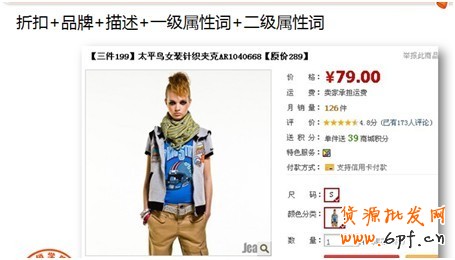 “韓版”風格,這個產(chǎn)品的風格屬性也定下了。“休閑小西裝領(lǐng)短外套”,這組詞匯我之所以放在一起,既可以拆分成“休閑小西裝”“短外套”也可以拆分成“休閑 西裝”“短外套”也就是說,這個短語也覆蓋了很多的搜索信息。最后一組數(shù)字“W33030”是這個商品的貨號。其中覆蓋了現(xiàn)在的季節(jié)當中以下熱搜詞匯“購物新風尚”“韓版”“女裝”“2013”“西裝”“外套”等等熱搜詞匯。在這里,其實除了熱搜之外,商品的基本屬性表達的也很明確。這是大牌的做法,小賣家可以借鑒,但考慮到小賣家資金實力不夠,所以在設(shè)置商品屬性詞時,可以從小處著手,不像他們那么覆蓋廣,力求覆蓋精。