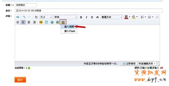第二步,進(jìn)入新建模塊的構(gòu)建頁(yè)面,把相關(guān)的信息填寫(xiě)完整。主要填寫(xiě)好模塊的標(biāo)題,然后插入視頻即可。當(dāng)然,你也可以適當(dāng)?shù)木庉嬏砑有┠芡怀鲆曨l的文字,但要注意精簡(jiǎn)。