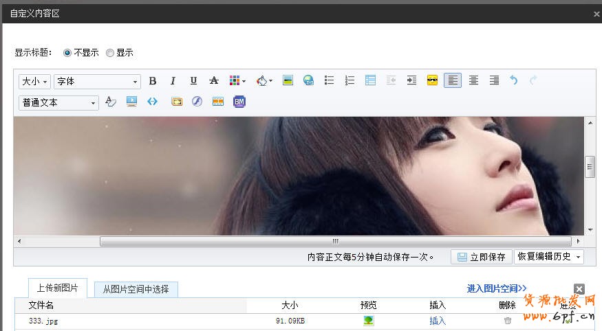 第十二步:在裝修后臺(tái)“頁(yè)面管理”中,最頂部創(chuàng)建一個(gè)自定義模塊,然后將這個(gè)前景圖像上傳到自定義區(qū),入下圖所示。