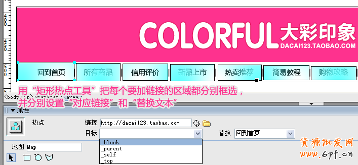 點(diǎn)擊圖片,選擇“矩形熱點(diǎn)工具” 這個(gè)很有用哦,想在什么區(qū)域畫都可以哈,比如可以做產(chǎn)品圖片的鏈接,旺旺的鏈接,分類的鏈接等等。設(shè)置了熱點(diǎn)區(qū)域后就可以隨意鏈接了,很強(qiáng)大吧!