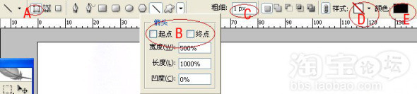 然后在【直線工具欄】對直線屬性進(jìn)行設(shè)置,如下圖A、B、C、D、E五個部分分別進(jìn)行設(shè)置(加油哦!設(shè)置步驟有點復(fù)雜,是為了繪線的時候一步到位)。