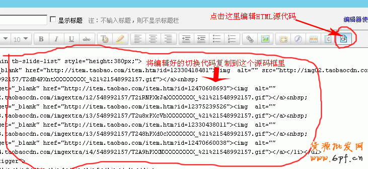 當(dāng)然先要做好圖片啰!要記住,所要切換的所有圖片大小必須相同,淘寶右邊的這個(gè)自定義促銷(xiāo)區(qū)寬度為750像素,所以我們的做的切換圖片寬就設(shè)成750像素 了,至于高,根據(jù)寶貝情況而定,但不要做得太大,以免影響找開(kāi)速度。做好圖片后上傳到圖片空間,再編輯好切換代碼,至于切換代碼哪里有,在百度搜索一下就 知道了,呵呵。再按以下步驟在自定義促銷(xiāo)區(qū)添加代碼: