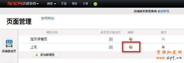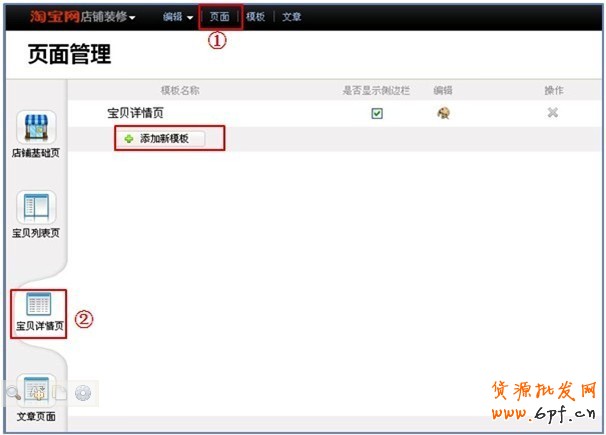 第一步:進入【我是賣家】-->【店鋪管理】-->【店鋪裝修】,進入裝修后臺之后點擊【頁面】,找到寶貝詳情頁點擊【添加新模板】,如下圖所示: