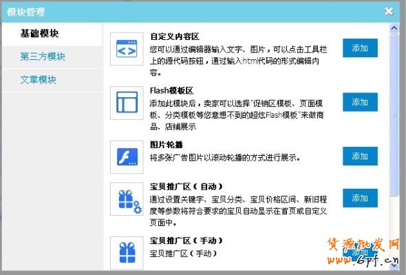 接下來(lái)就是在通欄布局上點(diǎn)擊添加模塊,選擇您想添加的模塊即可,如下圖所示: