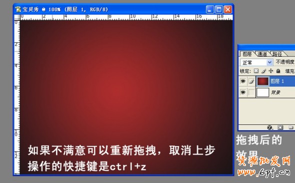 Step4:將數(shù)值設(shè)置OK以后,就可以進(jìn)行下一步啦!填充顏色,也就是把圖層1上色。首先選擇工具欄中的漸變工具,