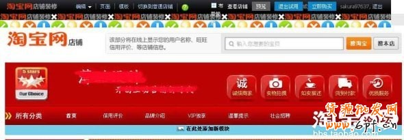 13、返回到剛才的淘寶網(wǎng)店鋪裝修頁面退出試用。點紅色框框的退出試用。為什么要退出試用呢?因為接下來要將剛才復制的代碼粘貼到自己的店鋪里,淘寶是不允許打開兩個頁面的店鋪裝修進行裝修的,所以要先退出試用。
