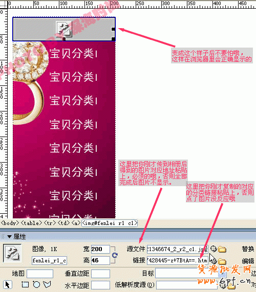 點(diǎn)擊分類名稱的圖片,在源文件處填入對(duì)應(yīng)圖片的網(wǎng)址【圖7】,就是第三步你傳到相、冊(cè)后得到的圖片網(wǎng)址【圖6】,必須的哦,否則最后圖片不顯示。然后到你的店鋪得到對(duì)應(yīng)的分類地址(點(diǎn)擊分類名稱,然后復(fù)制瀏覽器地址欄里的地址),在下面鏈接處黏貼網(wǎng)址【圖7】,依次為全部圖片添加上對(duì)應(yīng)的圖片地址以及分類鏈接。這步很關(guān)鍵,圖片必須對(duì)應(yīng),分類網(wǎng)址也必須對(duì)應(yīng),建議一個(gè)圖片接一個(gè)圖片的來。頂部以及底部有裝飾類的圖片的話,就只給換上圖片網(wǎng)址就行,無需加鏈接了。