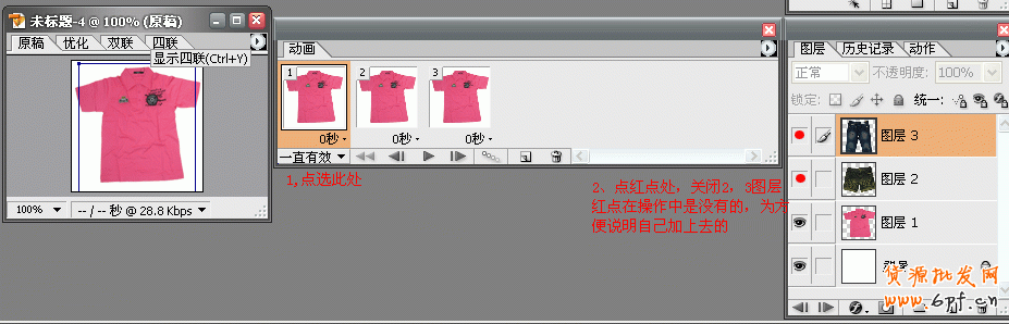 7、選中動畫窗口中的第一幀,再在【圖層】中關閉圖層2,圖層3(點上圖中眼睛處即可),圖解如下。