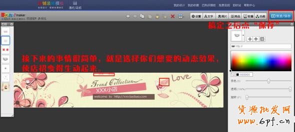 一切搞定,別忘了點(diǎn)保存!店招上可以顯示自己增加的動態(tài)效果了!扶植版不花錢照樣做出淘寶動態(tài)店招效果。