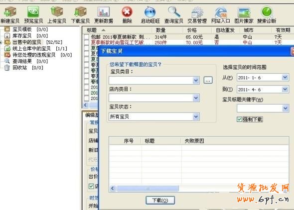 接下來打開淘寶助理,把店展里的所有寶貝下載下來,如圖操作: