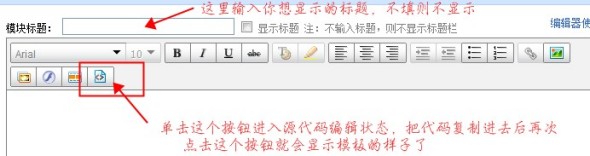 首先解釋一下這個標(biāo)題,一個模塊就是一個單獨的個體,每個模塊上面都可以有標(biāo)題,我們可以自定義成“本店熱賣”、“特價促銷”等等這些標(biāo)題,標(biāo)題填好了記得勾選后面的復(fù)選框,否則也是不顯示的哦。當(dāng)然你嫌有個標(biāo)題不好看的話就不用管它了,然后點擊下面框框里面的源代碼標(biāo)識進入代碼編輯狀態(tài)
