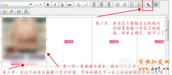 如下圖:先把圖片空間的圖片復(fù)制,然后直接在編輯框中間右鍵粘貼即可,粘貼后有時候會出現(xiàn)下面的動畫價格標(biāo)簽跟在主圖后面,把模板給撐開了,這時只需要在主圖后面點擊一下,然后回車,那個小圖標(biāo)就下來了。圖片放進來了以后我們再單擊它,會有個虛線框把它框起來,然后再點擊右上角的【超鏈接】按鈕,在彈出的窗口里面輸入對應(yīng)的寶貝鏈接,確定。這樣別人點擊這個圖片就會馬上跳轉(zhuǎn)到相應(yīng)的寶貝頁面。最后一步就是在那個閃動的標(biāo)簽后面加上您的寶貝價格,讓別人可以同時看到更多的寶貝信息。