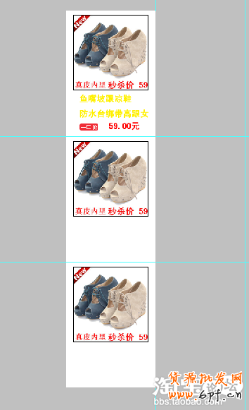 好了,分割好后,我們就要放入寶貝圖片了,我們將事先準(zhǔn)備好的寶貝圖片拖動(dòng)到相應(yīng)的位置即可,對(duì)了,差點(diǎn)忘了,在標(biāo)準(zhǔn)版中首頁(yè)推廣頁(yè)面的寶貝圖片一般是160*160px,所以我們這里也把寶貝圖片調(diào)成同樣大小的像素,這樣看起來(lái)跟其他的比較匹配,當(dāng)然大家也可以根據(jù)自己的喜好進(jìn)行設(shè)置哦。我們把所有寶貝都拖到分割好的圖層中后,再每個(gè)寶貝下面可以利用文字工具輸入寶貝的名字和價(jià)格。
