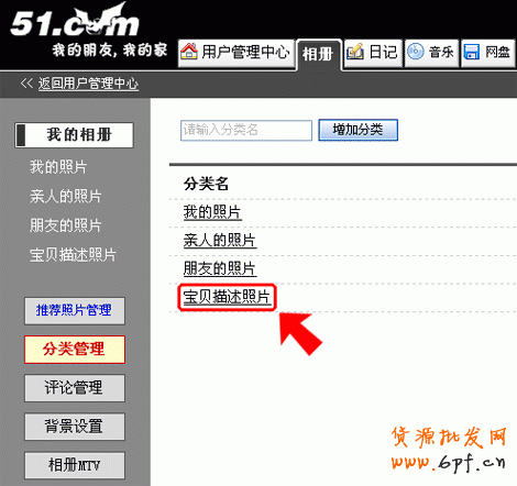 新的照片分類創(chuàng)建好后,我們點擊新創(chuàng)建的分類:“寶貝描述照片”鏈接進入