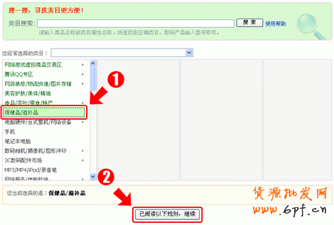 選擇合適的寶貝類目,如:“保健品/滋補品”①,然后點擊“已閱讀以下規(guī)則,繼續(xù)”按鈕