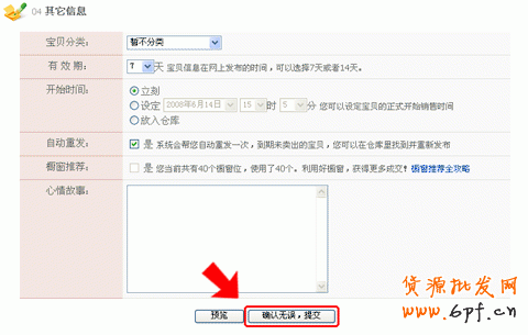 然后填寫寶貝其他信息,最后點擊“確認無誤,提交”按鈕。