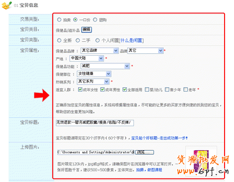 填寫寶貝相關信息:如寶貝標題、寶貝屬性、上傳寶貝照片等信息