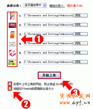 在“在圖片上印上我的網(wǎng)址, 防止被盜(Gif格式的圖無法印網(wǎng)址)”和“將超過1024*768的圖縮到合適大小”兩個選項前取消“√”①,然后點擊“開始上傳” 按鈕②。