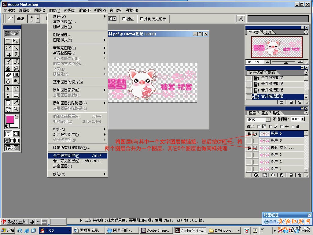 6. 現(xiàn)在,我們把復(fù)制好的6個(gè)文字圖層,分別與6個(gè)畫(huà)面圖層一一合并,具體辦法是,選中一個(gè)畫(huà)面圖層,與一個(gè)文字圖層做鏈接,然后按CTRL+E,將其兩個(gè)圖層合并為一個(gè)圖層;其它5個(gè)文字圖層與畫(huà)面圖層亦做此處理。